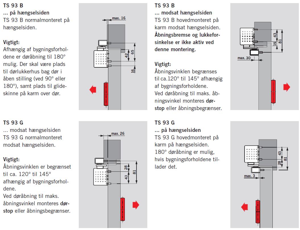 Eksempel på monteringsmuligheder for Dorma TS93 og TS93G dørlukker: